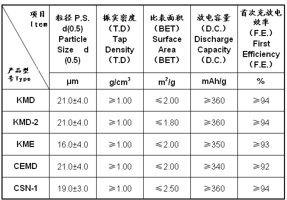 1、Main features ①、High capacity and steady discharge volt due to its nearly-perfect crystal structure and high temperature treatment experience. ②、High coulomb efficiency of the first cycle and excellent cycle performance due to the core-shell structure. ③、Conquered the conductivity anisotropy of graphite to some extent and excellent processing performance due to the sphericity. 2、Characteristic Parameter