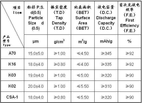 1、Main features ①、High coulomb efficiency of the first cycle and excellent cycle life due to the core-shell structure。 ②、Excellent processing performance due to the sphericity。 ③、Excellent electrochemical performance at low temperature due to the special crystal structure controlling experience。 2、Characteristic Parameter